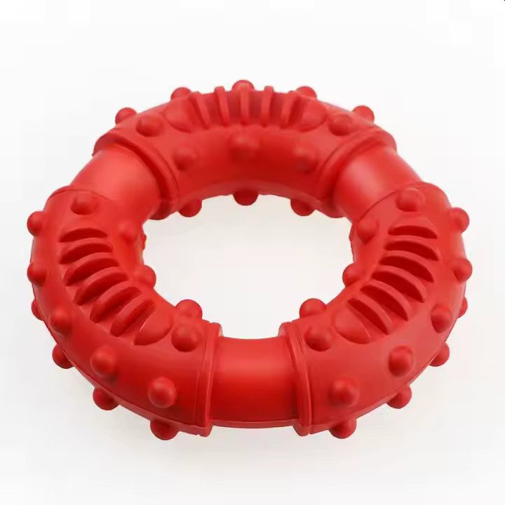 Aro de goma maciza y texturada, ideal para perros con mordida fuerte. Su diseño circular permite morder desde cualquier ángulo, mientras las texturas masajean encías y fortalecen la mandíbula.