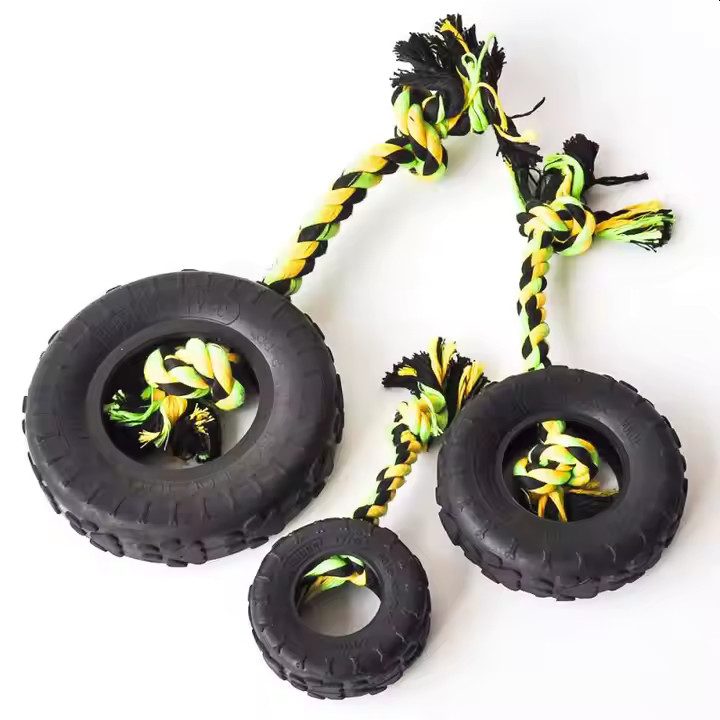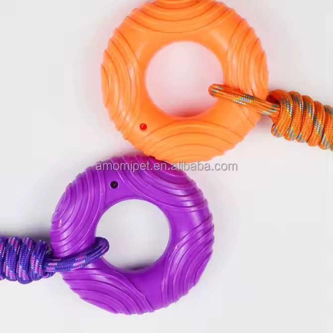 Juguete con aro de goma y soga resistente, ideal para juegos de lanzar, tirar y fortalecer la mordida de tu perro.