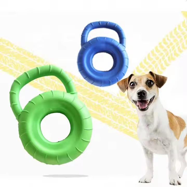 Juguete circular con manija incorporada, ideal para tirar, lanzar y morder. Su diseño permite juegos interactivos y entrenamiento de fuerza