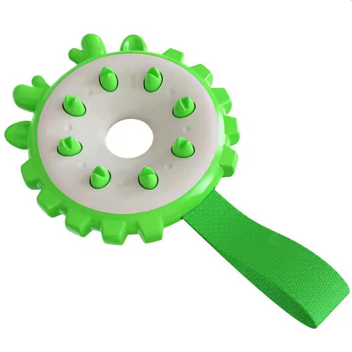 Juguete interactivo con diseño tipo engranaje solar que combina diversión, limpieza dental y resistencia. Su mango textil lo hace ideal para juegos de tracción y vínculo entre humano y mascota.